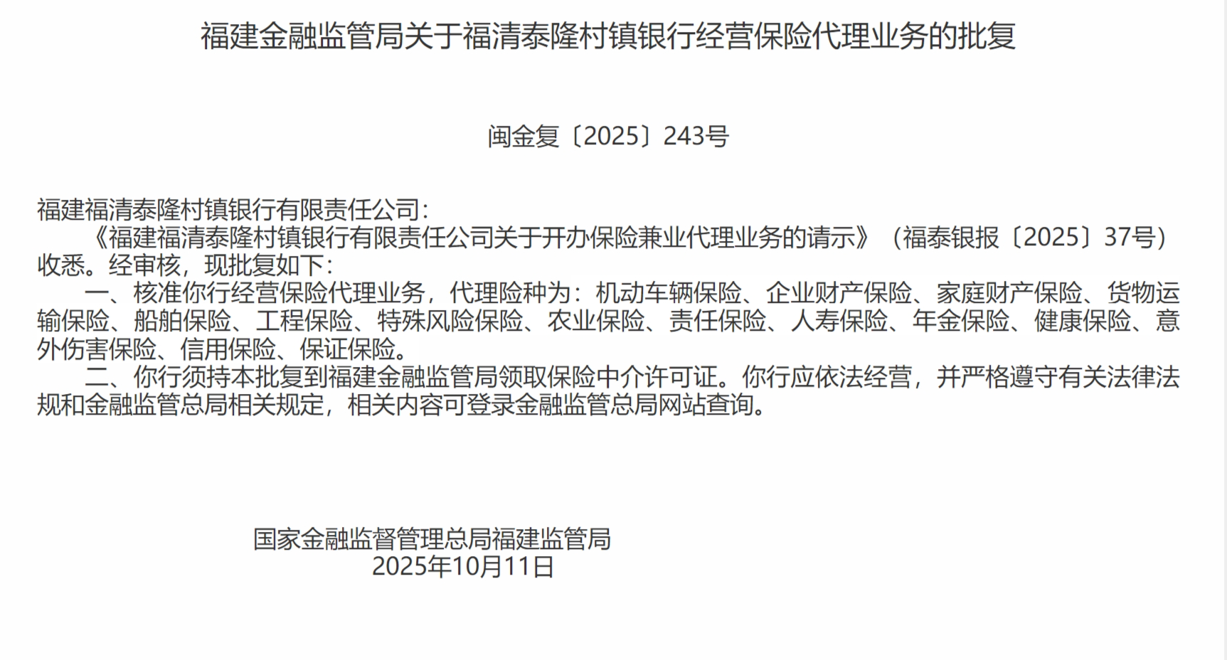 10月16日在线配资门户投资,福建金融监管局发布关于福清泰隆村镇银行经营保险代理业务的批复,核准该行经营保险代理业务,代理险种为:机动车辆保险、企业财产保险、家庭财产保险、货物运输保险、船舶保险、工程保险、特殊风险保险、农业保险、责任保险、人寿保险、年金保险、健康保险、意外伤害保险、信用保险、保证保险。该行须持本批复到福建金融监管局领取保险中介许可证。